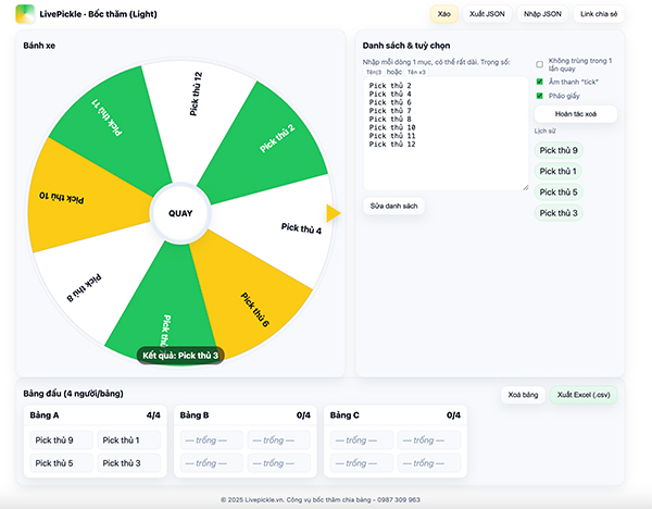 Bốc thăm seed/slot, cân bảng theo tiêu chí, xuất danh sách.